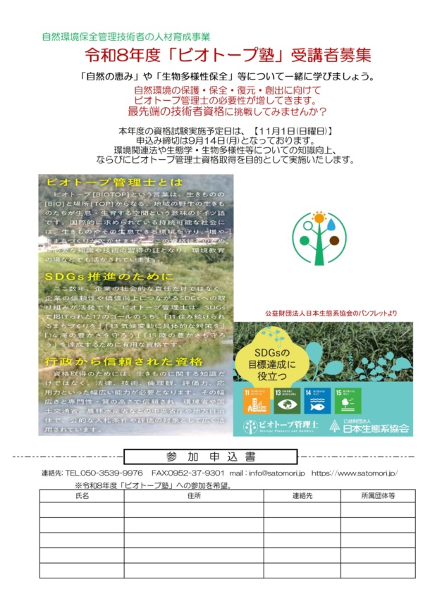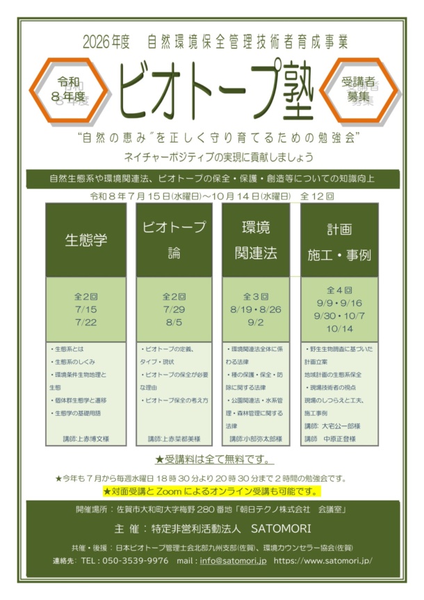 インフォメーション ビオトープ塾 令和8年度 2026/04/07 令和8年度のビオトープ塾実施計画です。 今年度も参加費無料でオンライン受講も可能です。(自宅からでも参加できますよ) 受講したい科目だけでも歓迎いたします。 インフォメーション一覧
