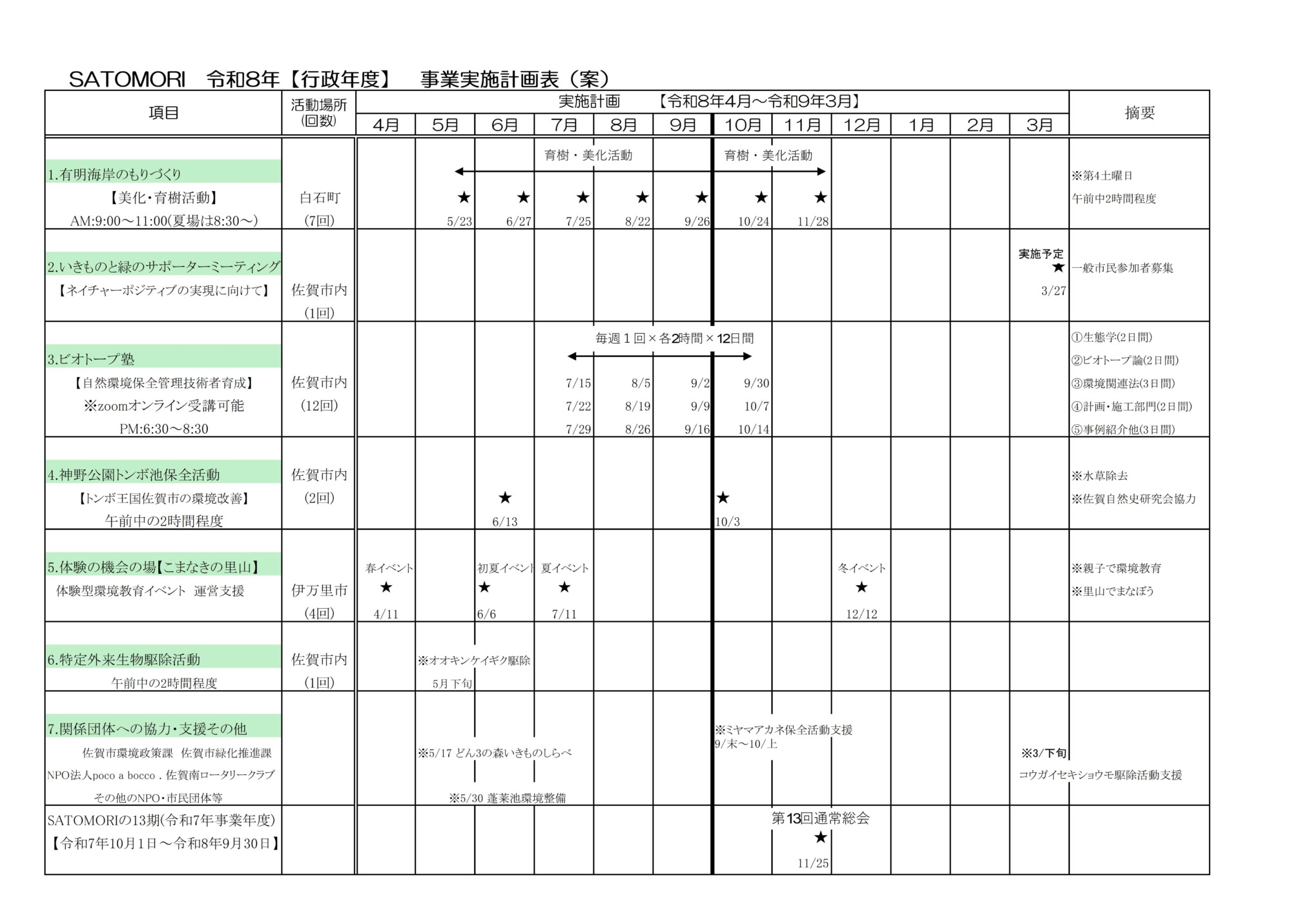 インフォメーション SATOMORI年間実施計画 2026/04/07 令和8年度 SATOMORI事業実施計画表(案)です。 会員 非会員を問わず多くの皆様のご協力をお願いいたします。 インフォメーション一覧