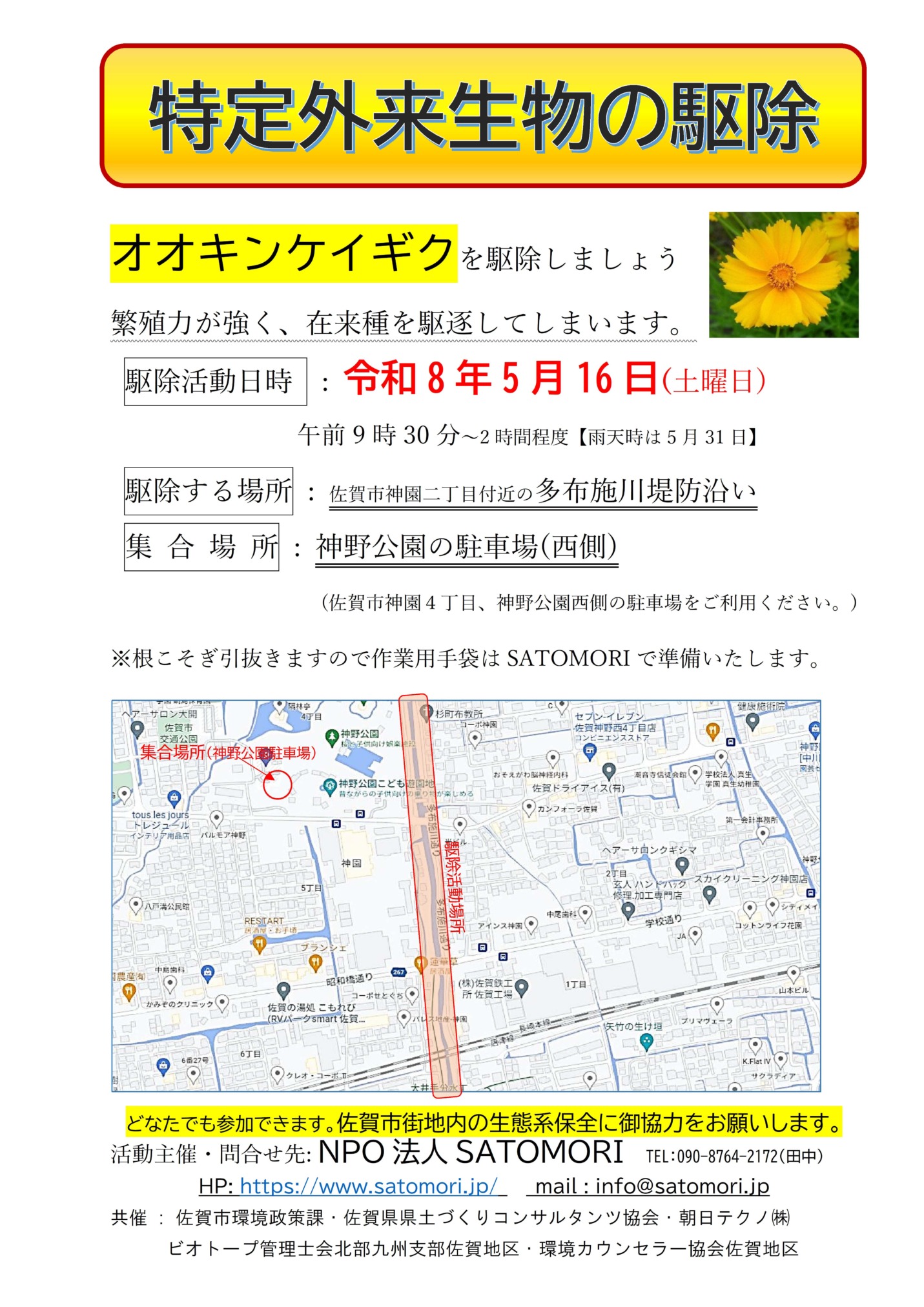 インフォメーション オオキンケイギク駆除活動 2026/04/27 オオキンケイギク駆除活動を今年も実施いたします。 佐賀市内の多布施川沿いのオオキンケイギクは徐々に減少傾向にあります。3年間継続して駆除活動を実施した成果だと思われますが、根絶するためにもこの活動を今年も実施いたしますのでご協力をお願いいたします。 インフォメーション一覧