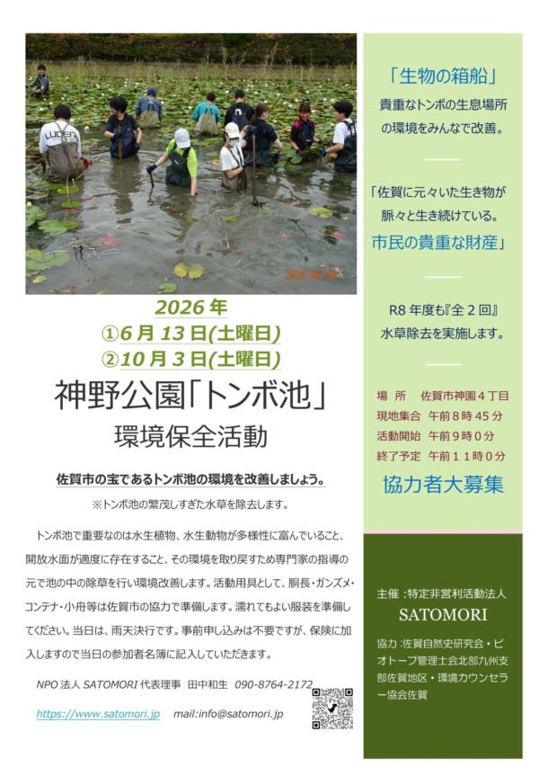 インフォメーション 神野公園トンボ池保全活動 2026/04/27 神野公園トンボ池保全活動の開催日が決定しました。 トンボ池の改修計画が進んでおり工事着手が今年度に予定されております。水草の成長は昨年同様に繁茂しており、生き物の生息環境は良好とは言えません。市街地内にこのようなトンボたちの生息が存在するのは大変貴重だと思われます。みんなで環境改善の為水草除去を実施しましょう。 多くの皆様のご協力をお願いいたします。 インフォメーション一覧