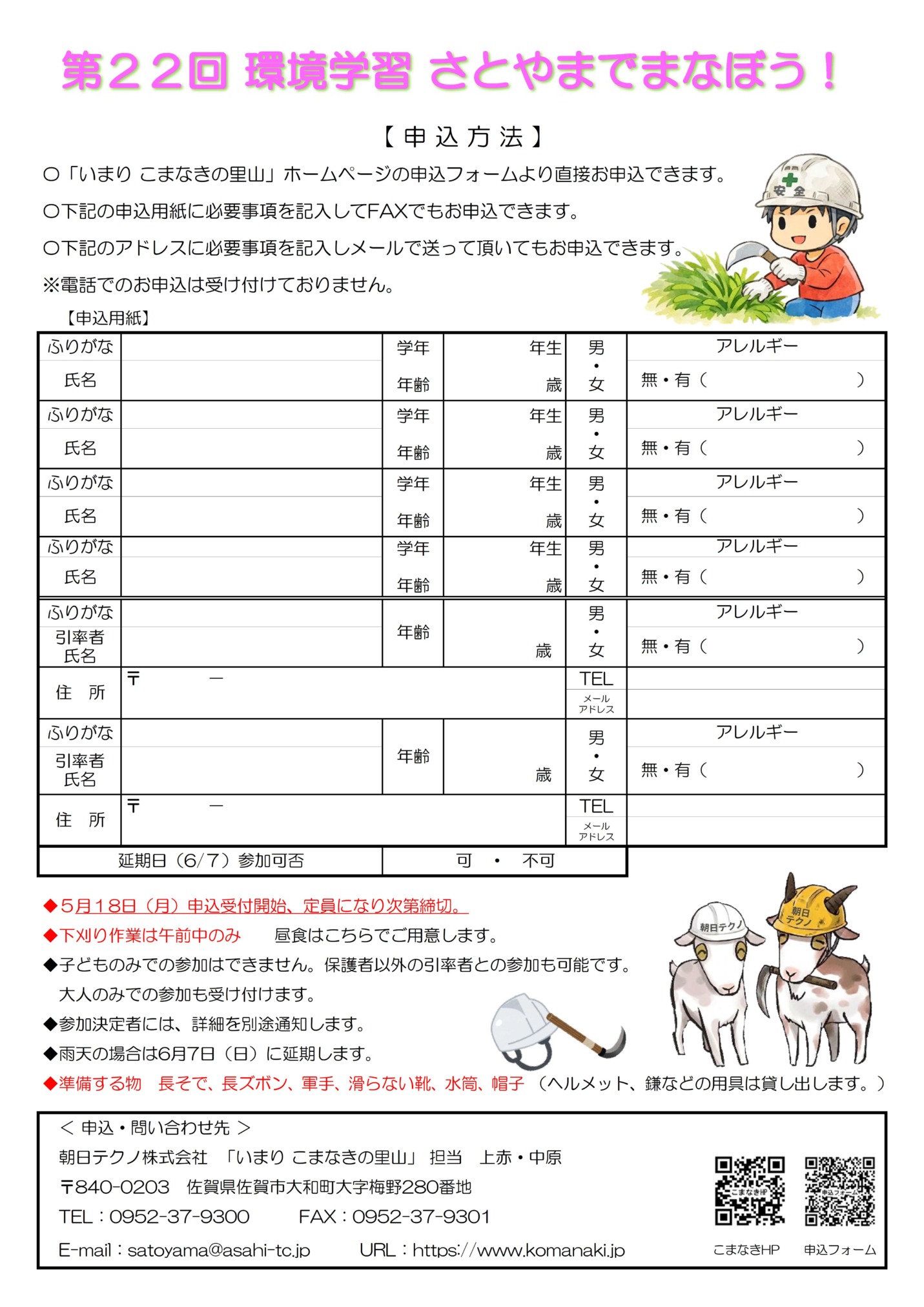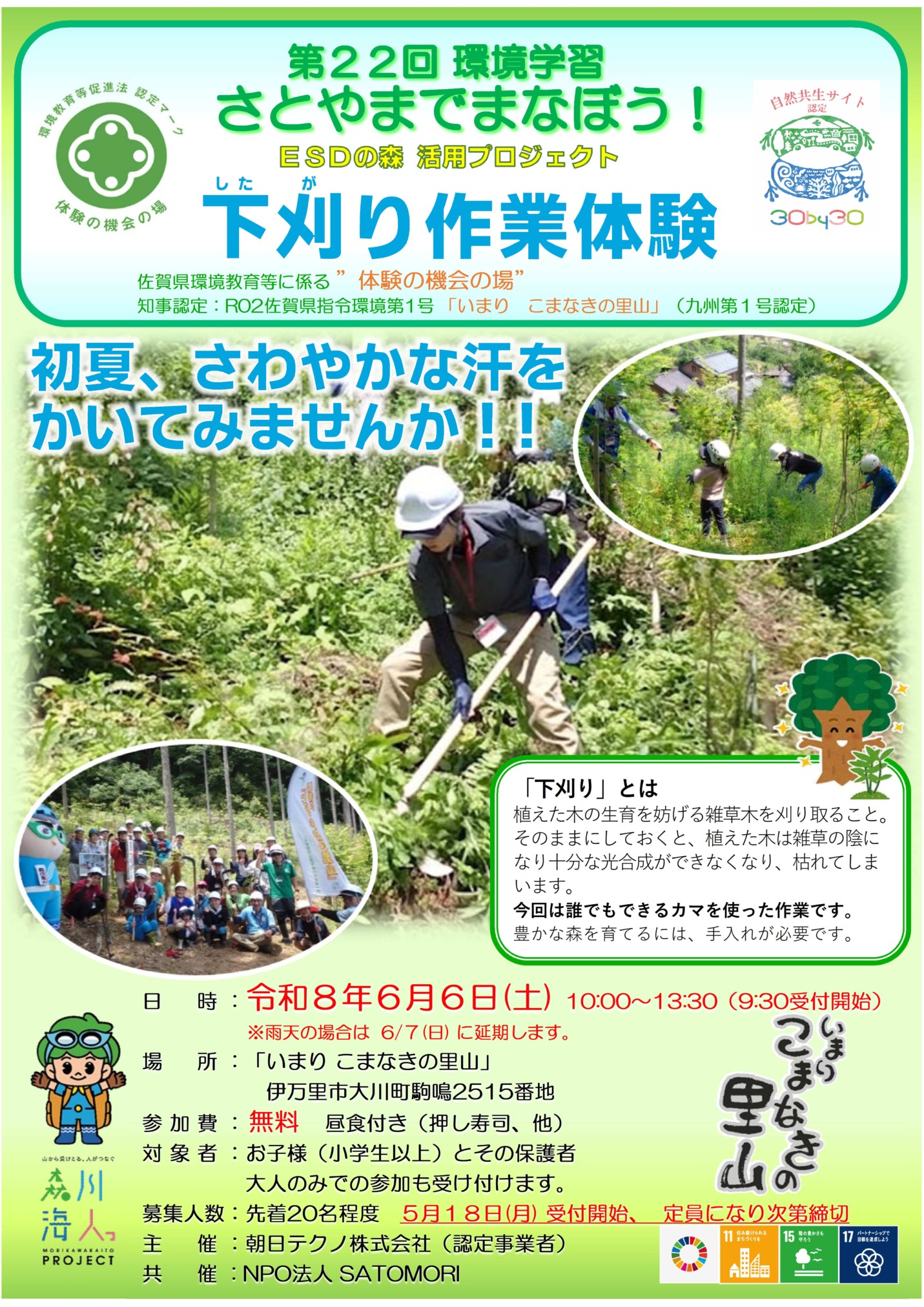 インフォメーション こまなきの里山 初夏イベント 2026/04/27 さとやまでまなぼう 第22回環境学習 初夏イベントでは、2年前に植樹したESDの森で下草刈りの体験です。植樹した「さがの樹」は順調に成長してますが、雑草や蔓が成長阻害の原因となります。樹木が元気に成長し森林の公益的機能を発揮してくれるよう育樹作業の一環として下刈り作業を行います。植樹に参加された方は勿論、自然環境保全活動に関心をお持ちの方は是非参加して下さい。皆様のご協力をお願いいたします。 インフォメーション一覧