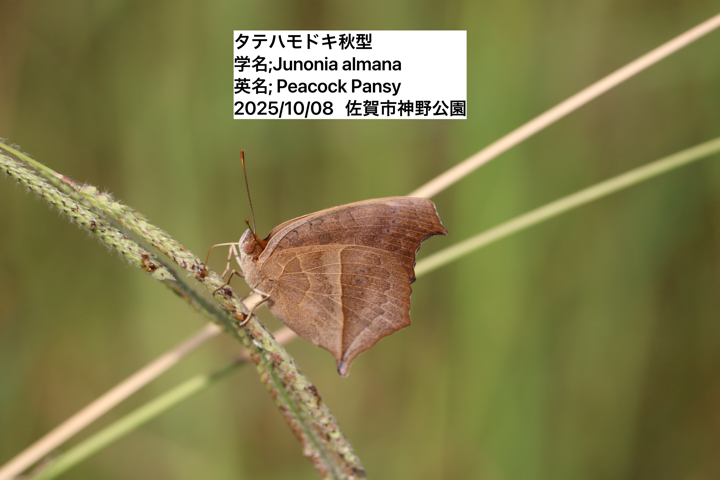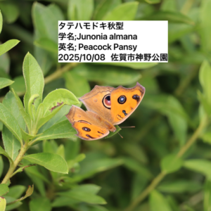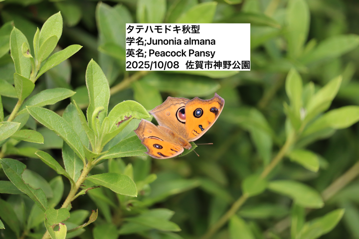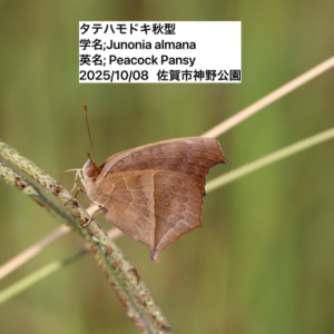 フォトアルバム タテハモドキ秋型が増えてきました 2025/10/20 よっちゃんから投稿していただきました。10月になり今年もタテハモドキの秋型が増えてきました。まだ夏型もいるようですね。翅の裏面が枯葉にそっくりなのが秋型で、このまま越冬します。 翅(はね)を閉じて止まっている秋型。枯葉にそっくりです。 翅(はね)を開くとオレンジの地色に目玉模様。 これは夏型。秋型とは模様が違います。 フォトアルバム一覧